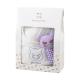 <圍兜> 表布:100% 純棉 滾邊:65% 聚酯纖維、35% 純棉 <搖鈴> 黃色76% 純棉、24% 聚酯纖維;綠色/紫色:100% 純棉 、填充物:100% 聚酯纖維